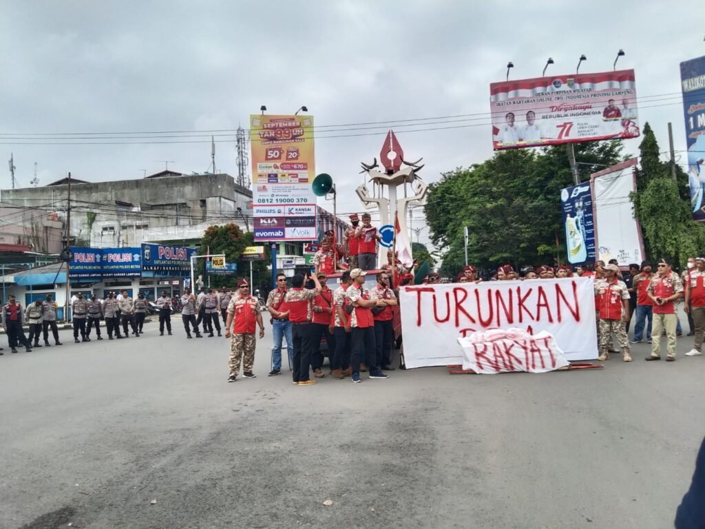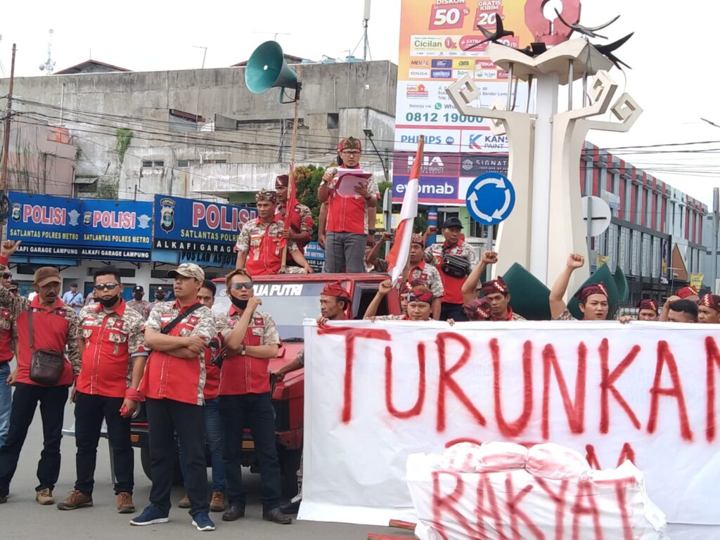 - Pukul 09.35 Wib Peserta aksi melakukan orasi di seputaran Tugu Pena Kota Metro, dengan membentangkan spanduk dan keranda bertuliskan “Turunkan Harga BBM”.