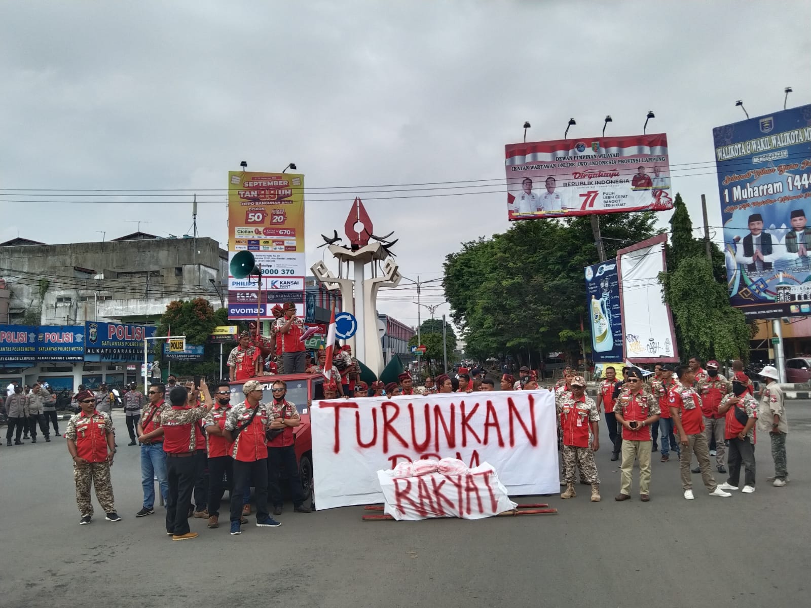 12 September 2022Pada hari Senin, 12 September 2022, Pukul 09.35 Wib, bertempat di Tugu Pena Jalan Jend Sudirman Kota Metro, telah dilaksanakan Aksi unjuk rasa Turun ke jalan, Penolakan Kenaikkan Harga BBM oleh Ormas Gerakan Masyarakat Lokal Indonesia (GML). Surat pemberitahuan kegiatan sudah disampaikan ke Polres Metro.Sehubungan dengan hal tersebut di atas, dapat kami laporkan kepada Bapak sebagai berikut :