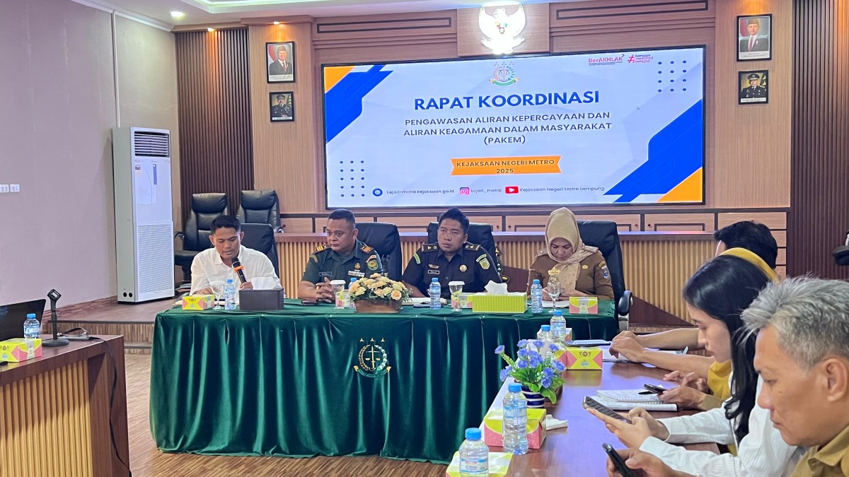 Metro, 23 Juni 2025. Dalam rangka menjaga ketertiban, stabilitas sosial, serta pengawasan terhadap keberadaan dan aktivitas aliran kepercayaan masyarakat, Kejaksaan Negeri Kota Metro menggelar Rapat Koordinasi Tim Pengawasan Aliran Kepercayaan Masyarakat (PAKEM) Kota Metro Tahun 2025 pada hari Senin, 23 Juni 2025, bertempat di Aula Adhyaksa Kejaksaan Negeri Kota Metro, Jalan AH. Nasution No. 125, Kelurahan Yosodadi, Kecamatan Metro Timur.
